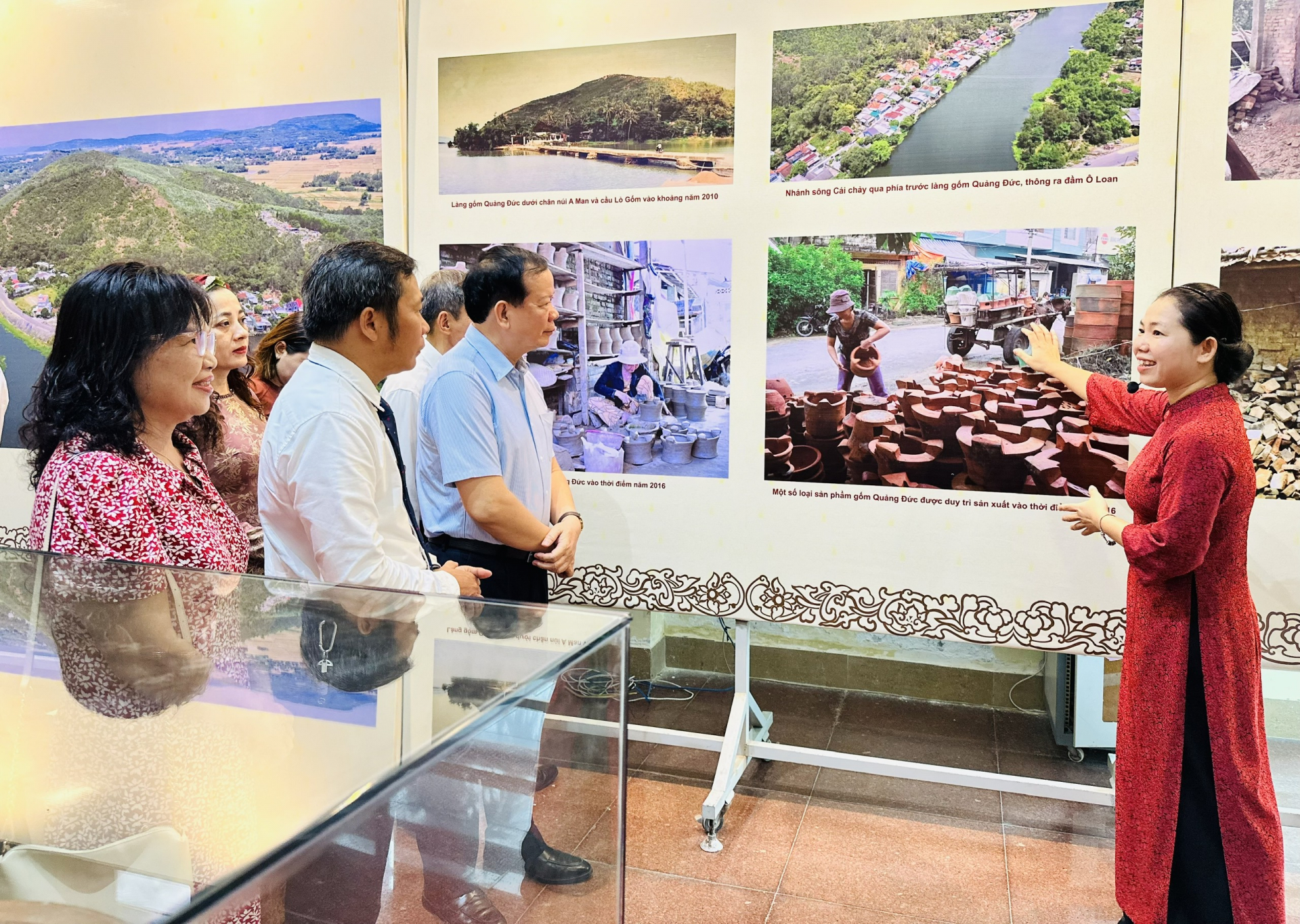 | The delegates attending the seminar on “Preserving and Promoting the Cultural Heritage Value of Quang Duc Pottery,” organized by the Department of Culture, Sports and Tourism, visiting the Phu Yen Museum and listening to a guided presentation on Quang Duc pottery |
